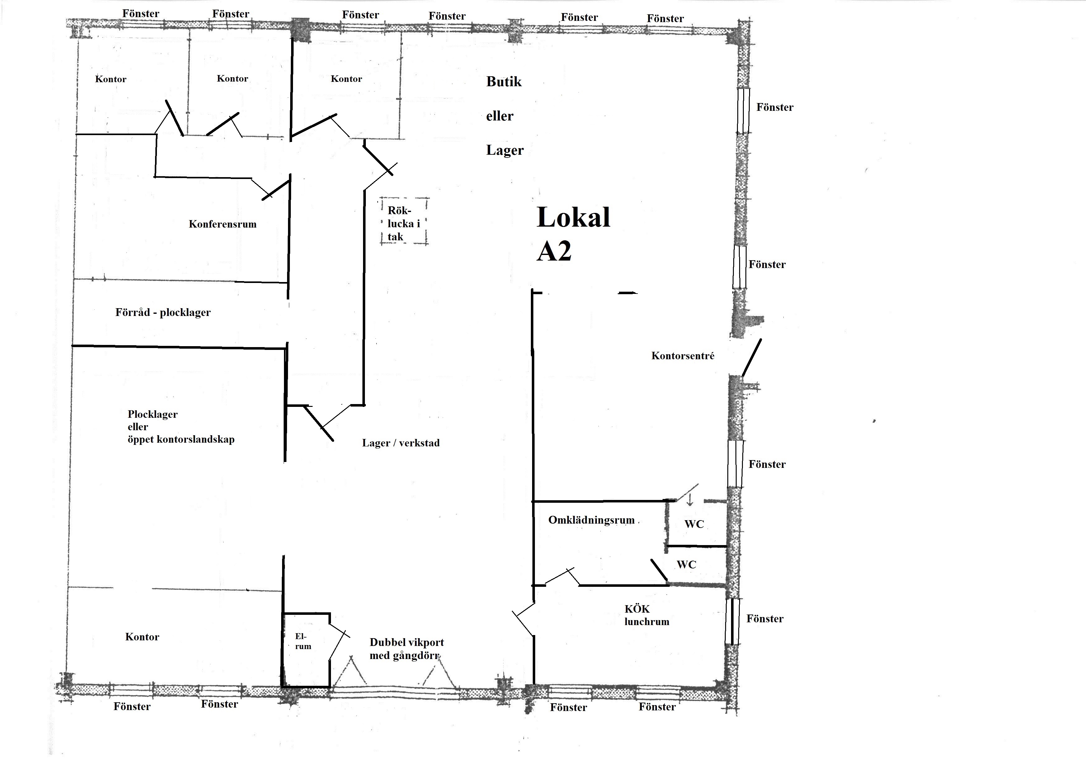NYRENOVERAD ! Lokalens totala yta är på ca 331 m². Kontorsdelen är på ca 191 m² med butiksarea, 4 st stora kontorsrum, öppet kontorslandskap, konferensrum, plocklager, kök, 2 st WC, DUSCH, samt en lagerdel på ca 140 m² med port och gångdörr. Personal/butiksentré på gaveln och port på långsidan av huset. Lagerdelen har en takhöjd ca 3,8-4,5 m. Port i lagret är ca 3,5 m bred och ca 3 m hög. Entresolplan finns ovanpå kontorsdel. Lokalen kan enkelt nås med lastbil.