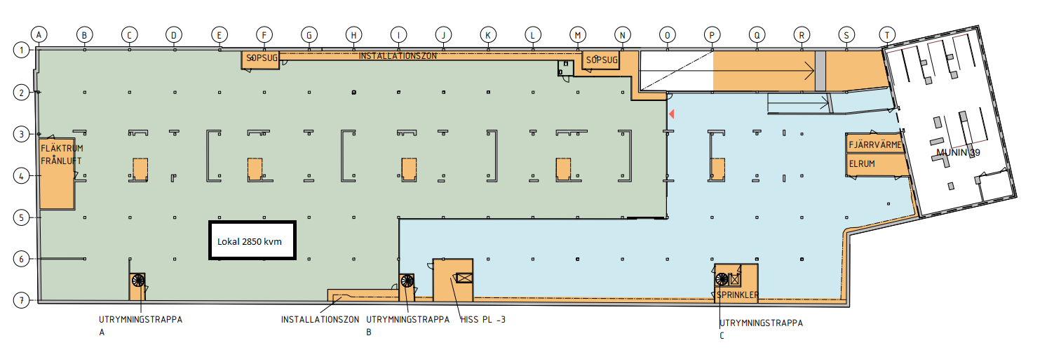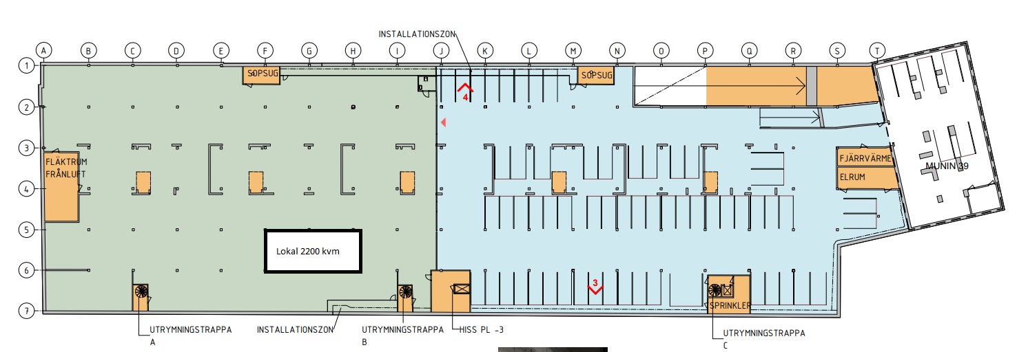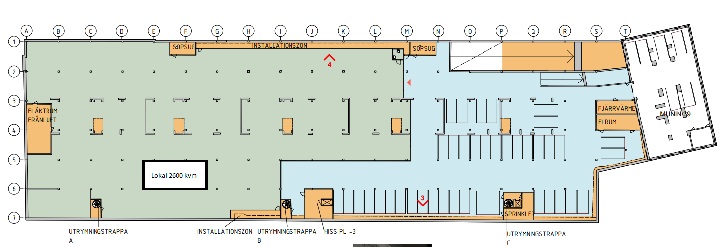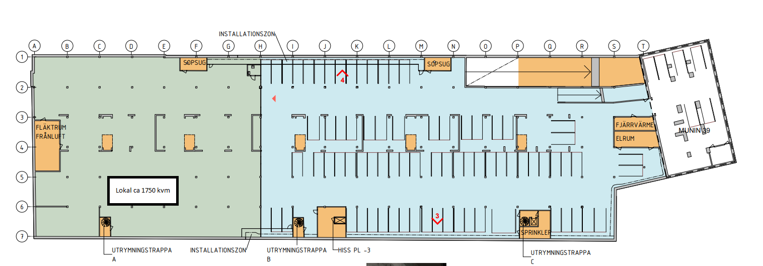 Ett garage ligger denna yta som går att dela på många olika sätt. Lokalerna går att bygga in i olika avdelningar. Nedfarten till garaget är ganska lång med en höjd på cirka 2,3 meter Hyra ca 850.000kr + moms.