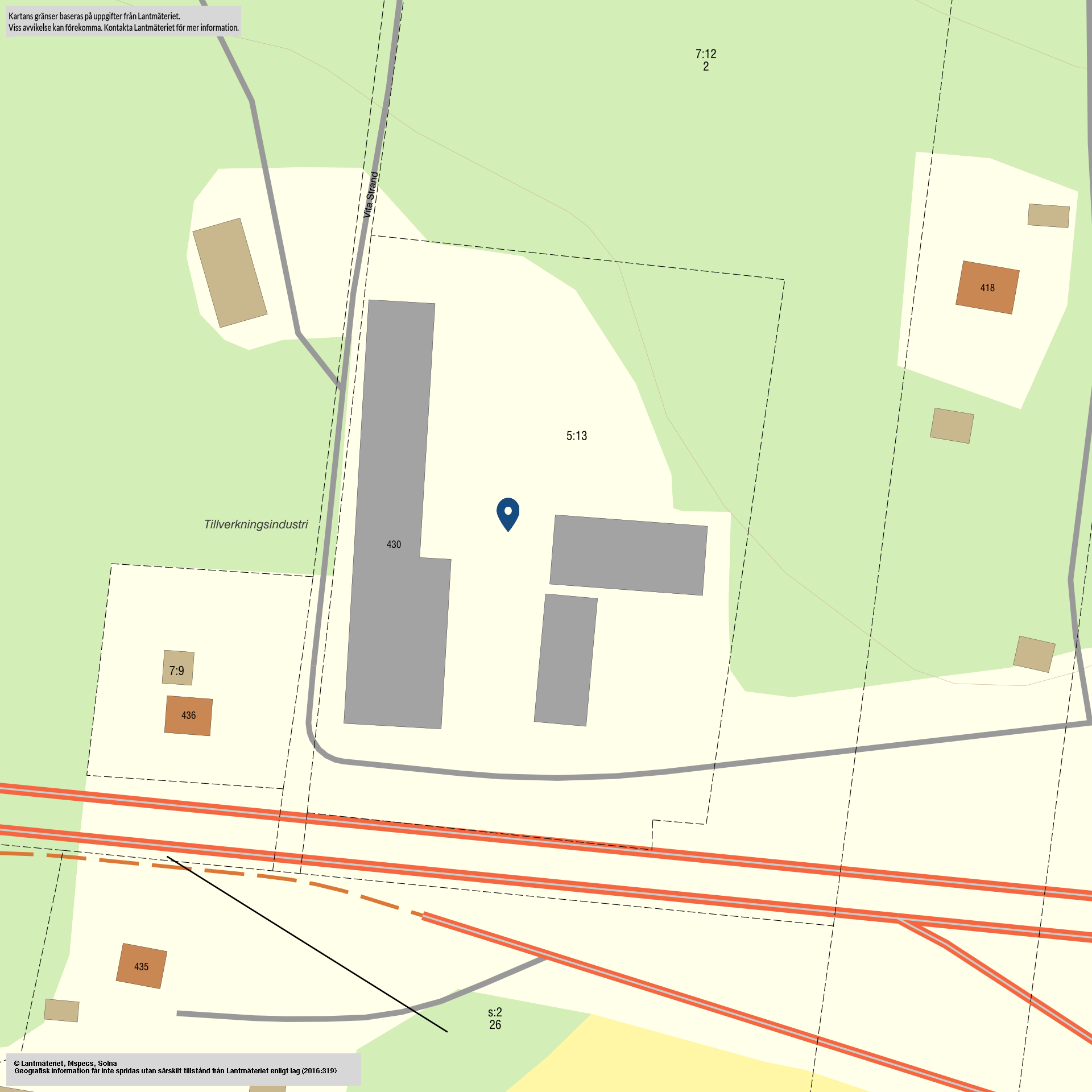 Beskrivning: Kallager, byggt på platta, plåtfasad och plåttak. Enligt säljare är arealen 420 m², taxerad uppgift 413 m².