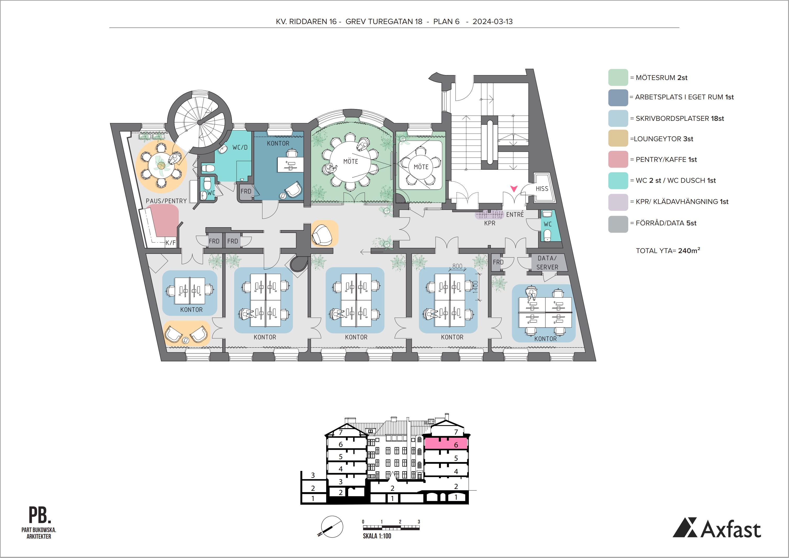 Välkommen till Riddaren 16, en stilfull fastighet strategiskt belägen mittemot Sturegallerian och bredvid den välkända restaurangen Grodan. Här har du all tänkbar service precis utanför dörren. På plan 6 finns fem rum i fil med stora, ljusa fönster mot Grev Turegatan. Alla rum har dubbeldörrar för att skapa extra rymd vid behov. Det finns även ett välutrustat konferensrum och 1-2 mötesrum för 4-5 personer. Trevligt pentry och tre wc varav en med dusch. Plan 7 erbjuder en exklusiv vindsvåning med egen terrass. Här inkluderas en öppen arbetsyta, ett rymligt konferensrum, mötesrum och ett samtalsrum. Ytterligare ett rum kan användas som mötesrum eller kontor beroende på era behov. Centralt i lokalen finns en imponerande loungeyta med högt i tak och direkt tillgång till terrassen, vilket skapar en perfekt social yta och tillfälliga arbetsplatser för dina anställda. Perfekt att ha som en extern del för kunder och andra besökare. Här finns också ett trevligt pentry och totalt tre wc, varav en med dusch. Lokalen är ljus, rymlig och utrustad med mekanisk ventilation och kyla för att garantera ett behagligt klimat året runt. Lokalen kan även fräschas upp i samråd med nästa hyresgäst. Välkommen på visning!