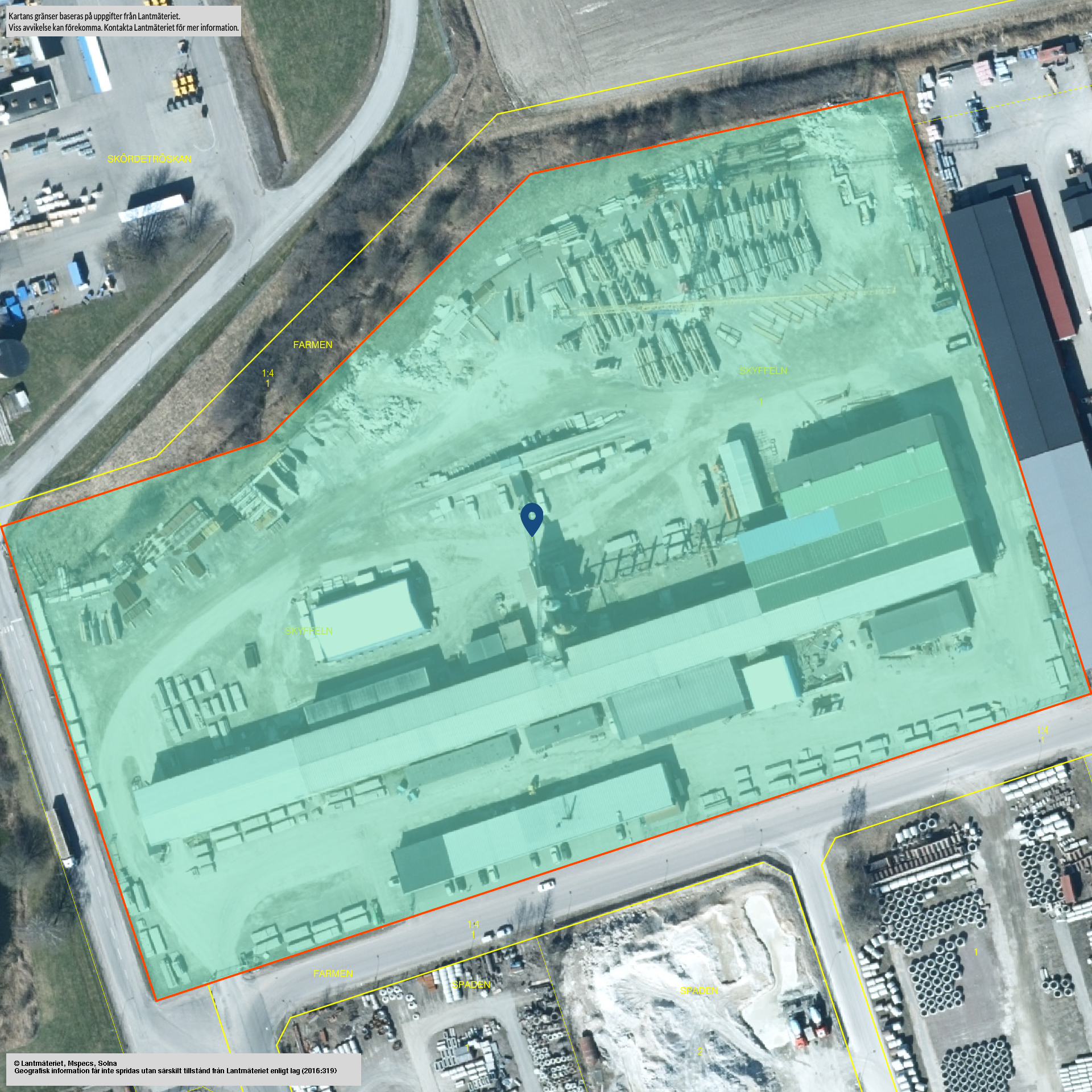 Beskrivning: GRUND: Gjuten betongplatta STOMME: Gjuten betong FASAD: Betongelement YTTERTAK: Plåt FÖNSTER: 2-glas INVÄNDIGA GOLV: Betong INVÄNDIGA TAK: Betongelement INVÄNDIGA VÄGGAR: Betong & målat PORTAR: Takskjutport 6 st och vikport 5 st. Portar är i olika storlekar och flera med genomkörning. INVENTARIER: - 9 st traverser, lyftkraft - 4 st 10 ton, 1 st 18 ton, 1 st 12,5 ton, 3 st 16 ton (INGÅR), - Armeringsrobot (INGÅR EJ men går att köpa till), - 11 st betongarbetsbord hydraliska vippbord samt 4 st större betongarbetsbord (INGÅR EJ men går att köpa till) Produktionsbyggnaden är utformad för ett linjärt produktionsflöde från råmaterial till färdiga element. Ballast hanteras på baksidan där grus lastas och förs via en maskinell ränna in till 10 balastfickor. Cement hanteras via 3 cementsilos. Råmaterialförsörjningen matar in i början av hall 1 och därefter är produktionsflödet igång. Fabriken har egen betongtillverkning med ett system som distribuerar betongen vidare till gjutytorna. I den långsmala produktionsdelen finns en automatiserad blandaranläggning placerad centralt mellan hall 1 och hall 2. Den sammanhängande produktionssträckan för hall 1 och hall 2 är 240 meter lång. TRAVERSER OCH LYFTKAPACITET I produktionsbyggnaden finns totalt 9 traverser, fördelade i alla hallar. Detta möjliggör internmaterialhantering i samtliga produktionssteg, exempelvis lyft och positionering av formar, armering och prefabricerade betongelement, samt effektiv förflyttning mellan arbetsstationer utan att vara beroende av truck i hela flödet. Traverslösningen ger även förutsättningar för hantering av tyngre komponenter och kortare ställtider i produktionen. HALL 1 OCH 2 – PRODUKTIONSYTA - 4 050 m² Hall 1 och 2 (3 700 m²) utgör huvudlinjen i produktionen med hydrauliska vippbord för gjutning. Hall 1 står 11 gjutbord (ingår ej) och hall 2 innehåller 4 gjutbord (ingår ej). Utformningen stödjer intern transport och ett rationellt flöde vidare mot efterföljande hallar. Utvändiga mått är ca 240 x 15,4 meter. I anslutning till hall 2 finns ett formsnickeri ca 350 m². HALL 3 – FORMHALL - 910 m² Från hall 2 finns öppning in till hall 3, som är en separat formhall. Här finns ett fast formbord med mått 34 x 7 meter (ingår ej) som kräver annan uppställning än i vippbordsdelarna. Utvändiga mått är ca 60,5 x 15 meter. HALL 4 – ARMERINGSHALL - 695 m² Från hall 3 finns öppning in till hall 4 som nyttjas som armeringshall. Hall 4 har angöringsmöjlighet mot baksidan, vilket underlättar hantering av armering och materialflöden kopplat till detta moment. Utvändiga mått är ca 45,7 x 15,2 meter. Fri takhöjd i hall 1–4 upp till takstolar är ca 8,7 meter. Undersida traverser är ca 7,2 meter. Uppvärmning sker med luftburen värme via fjärrvärme. Uppvärmning, kylning och ventilation UPPVÄRMNING: Värmekälla fjärrvärme. Aerotemprar, vattenburen. Ny värmeväxlare 2012. Direktverkande el i vissa utrymmen. VENTILATION: Självdrag förutom mekanisk frånluft i personalutrymmen. Vatten och avloppstyp Kommunalt vatten och avlopp. TV/internet Fiber finns indraget.
