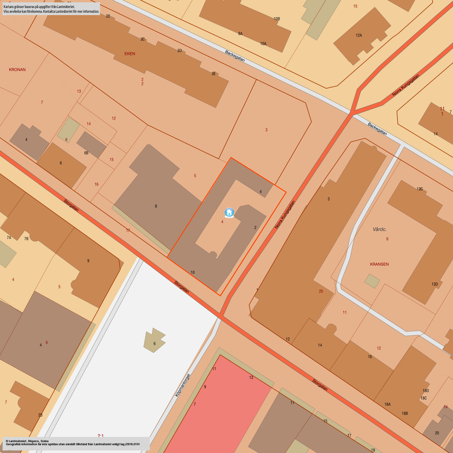 Beskrivning: Hyreshus 2,5 plans med vind, källare och sidobyggnader med vind, lokaler och delvis källare. Storgatan 10 På första plan finns 4 st affärslokaler På plan två finns två lägenheter. En 4 rok på 120 kvm och en 3 rok på 95 kvm På plan tre finns två lägenheter. En 2 rok på ca 93 kvm och en 2 rok på 63 kvm. Norra Kungsgatan 2 Ett cafe i markplan Ifrån gården en trappa upp en lägenhet 2 rok på 33 kvm. Norra Kungsgatan 4 En affärslokal Innergården och parkeringar Kall och varmlokal samt källarutrymmen Skillnaden i angivna kvm i taxeringsuppgifter samt verkligt uthyrda kvm beror på renoverade, ombyggda och ianspråktagna ytor som ännu inte har inrapporterats. OVK är utförd 20161005 Brandredskapsförteckning 20250425 Putsad fasad, 3 o 2 glasfönster, plåttak. Uppvärmning, kylning och ventilation Uppvärmning via fjärrvärme och luft-luftvärmepumpar Vatten och avloppstyp Ansluten till det kommunala VA-systemet