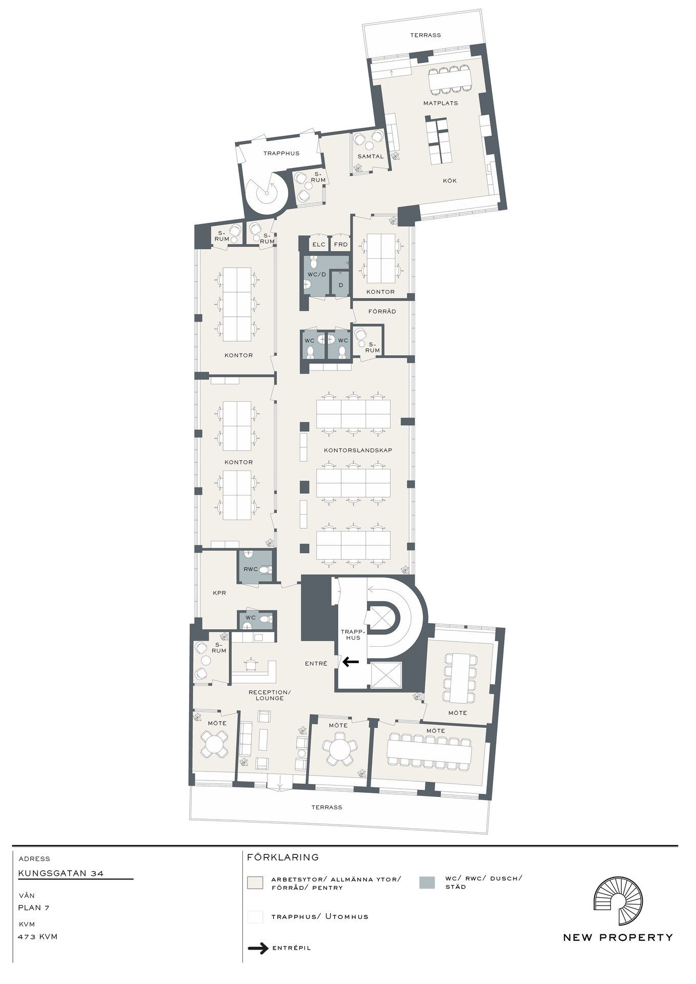 Varmt välkomna till representativa kontorsytor om 473 kvm på våning 7 i Stockholms mest eftertraktade affärsdistrikt. Detta är kontoret för det företag som prioriterar kvalitet, representation och medarbetarnas trivsel. Detta stilrent och modernt renoverade kontor erbjuder en oslagbar kombination av exklusivitet och funktionalitet. Läget på Kungsgatan 34 placerar er mitt i händelsernas centrum, omgiven av Stockholms främsta aktörer inom finans, juridik och konsultverksamhet. • Stilrent, välplanerat och modernt renoverat kontor • Högt och fritt läge med gott om ljusinsläpp. • Toppläge i CBD med omedelbar närhet till all tänkbar service och 1 minut till tunnelbanan. • Två terrasser med trevlig utsikt. Kontoret på plan 7 präglas av en genomtänkt och flexibel planlösning. Ytan är planerad med en kombination av intern del med öppet landskap och i både extern och intern del flertalet mötesrum i olika storlekar, från det lilla fokusrummet till större styrelserum. Den höga standarden och det fina skicket innebär att ni kan flytta in direkt och fokusera på er kärnverksamhet. Det unika med denna lokal är tillgången till två terrasser som vetter åt två väderstreck. Dessa erbjuder en privat utomhusyta som blir ett stort mervärde för personal som söker en andningspaus under arbetsdagen. Varmt välkommen på visning!