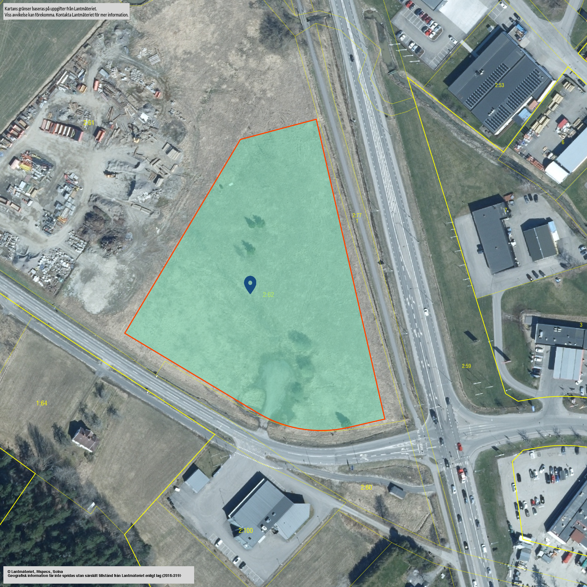 Markområde i Söderköpings norra entré. Markområdet inrymmer ca 18 000 m² och är lokaliserat i korsningen mellan E22 och Linköpingsvägen. Fastigheten befinner sig i ett spännande utvecklingsområde med hänsyn till nya dragningen av E22, tillhörande godkänt planprogram och pågående detaljplanearbete. Pågående detaljplanearbete syftar till att möjliggöra för verksamheter inom trafiknära service, handel och verksamheter. Aktuell detaljplan tillåter byggnation med verksamhet för bilservice, bensinstation och därmed förenlig verksamhet. Det pågående planarbetet för området hindrar ej utveckling av fastigheten i enlighet med gällande detaljplan. För mer information om både gällande detaljplan det pågående detaljplanerarbetet hänvisas till fliken "Dokument & Länkar". Försäljning av fastigheten sker via indikativa bud. Säljaren förbehåller sig fri prövningsrätt att fritt anta eller förkasta inkommet bud eller att hålla en efterföljande förhandling/auktion mellan budgivarna. Säljaren förbehåller sig även rätten att avsluta försäljningsprocessen eller ändra i beskrivna riktlinjer när som helst före undertecknandet av bindande överlåtelseavtal. Oavsett skälen till att försäljningsprocessen avbryts eller ändras ska respektive budgivare själv svara för de kostnader som uppkommit i samband med utvärdering av fastigheten. Försäljning av fastigheten sker i första hand genom försäljning av aktier i befintligt fastighetsägande bolag (Evolv Söderköping 2:62 AB). Bud lämnas på underliggande fastighetsvärde efter eventuella avdrag för latent skatt. Skattemässigt restvärde uppgick till 3 736 898 kr per 2025-11-03. Proformabalansräkning kompletteras under processens gång. Bud emotses skriftligen till ansvarig mäklare. Eventuellt urval sker löpande.
